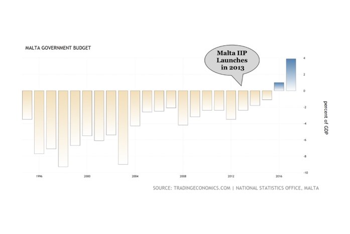 Malta’s budget surplus in 2017 reached €438.6 million, or an astonishing 3.9% of GDP, higher than any other EU country, and fourth highest in the world. In the year to July 2017, the Malta Individual Investor Programme (MIIP) raised €394.1 million (3.72% of GDP). Accounting for 90% of the difference, the island nation’s citizenship by investment program has effectively reversed a deficit trend that’s been in place for as long as statistics have been publicly available.